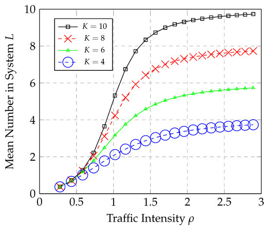 We observe that the mean number in the system has the same pattern when L is plotted against ; see Figure 11. Hence, the ML tool we developed is robust and can be used to study PH/PH/1/K systems and also GI/G/1/K systems in discrete time. The limitations of our model are that it is for the mean number in the system and cannot be used for studying the probability distributions of the number in the system.