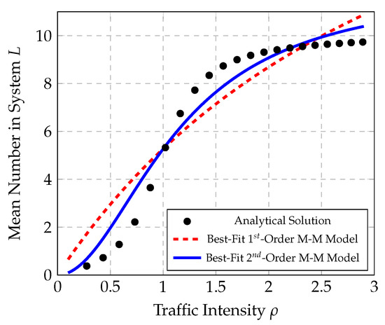 These results demonstrate how well the M-M model can characterize the behavior for the mean number in M/M/1/K systems, when . The goodness-of-fit is high for these examples, but decreases with increasing buffer capacity K. The results could be improved if a second-order M-M model was used instead for the fitting process, with the form of the second-order model shown as follows: