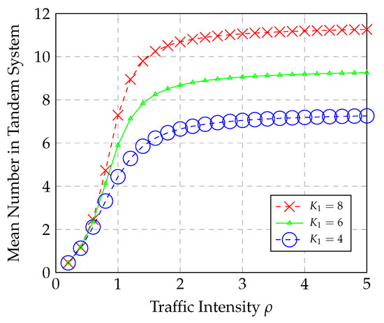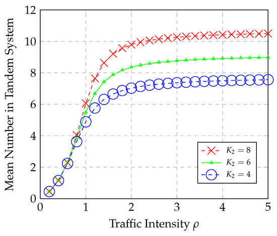 Figure 14 shows the behavior of the mean number in the tandem queue system with varying traffic intensity, which is defined as , where . Note that the number in the tandem queue system corresponds to the total number of items waiting in both queues, along with the items undergoing service in both servers. The results are shown for varying arrival rates ( and ) and for different capacities in the first queue with a fixed capacity of in the second queue. Figure 15 shows a similar set of results but instead for a fixed capacity of in the first queue and for different capacities in the second queue. Once again, we notice that the plots of the mean number in the tandem queue system follow the same pattern as that of the single node queues. Hence, it is a candidate for the application of supervised machine learning using non-linear regression tools based on the M-M model.