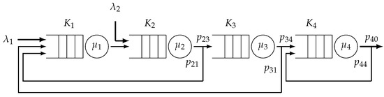 For the analysis in this example, we assumed the service time in each of the four single-server queues to be exponentially distributed with the fixed set of rates , , , and , with the queue capacities and . Note that queue capacities include the waiting space capacity plus the one in service. The routing probabilities in Figure 18 were assigned as follows: , , , , , and . The external inter-arrival times into the first two queues were also assumed to be exponentially distributed and the arrival rate into the second queue was assigned as . Unlike the case in Section 8, we assumed that entities arriving into a full queue are dropped and discarded from the system, regardless of whether these arrivals are from external entities or are fed back in from other queues. This assumption was necessary since the contrary could lead to the case where the queues are all full and then the system is in a locked state that prevents them from routing packets to other queues that are in the same locked state.