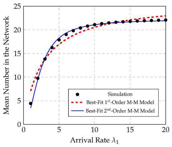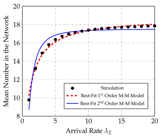 Deriving the mathematical model for this complex system is usually laborious, especially when it includes a larger number of queues. Even if it is successfully carried out, the computational task is a challenge. A simulation of the system was instead developed for evaluating the overall mean number in the system. The analysis was conducted for a varying external arrival rate (between 1 and 20), with all other system parameters remaining unchanged. The graph in Figure 19 shows how the mean number in the network varies with the external arrival rate . The same figure also includes the best-fit M-M model for the overall mean number in the system for both the first-order and second-order models. Due to the complexity in evaluating for this system, we opted to use instead of for determining the best-fit M-M model since is a function in terms of . The use of in place of also allows us to examine the robustness of the proposed technique. The coefficients for the best-fit M-M model are shown in Table 9.