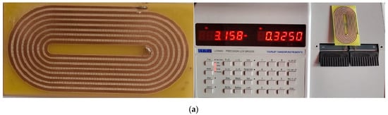 Figure 11 presents the constructed oval planar spiral inductor with a size of 20 × 40 mm size, with 16 turns, a turn width of w = 0.4 mm, and a distance between the turns of s = 0.2 mm, the same as the numerically modelled configuration.