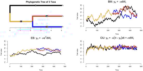 Scheme for stochastic trait evolution along a rooted phylogenetic tree. Upper left: A phylogenetic tree of three taxa with branch lengths. The colors represent different lineages: Black: Lineage leading to Taxon . Red: Lineage leading to Taxon . Blue: Lineage leading to Taxon . Orange: The shared ancestral lineage before divergence. Upper right: Brownian motion trait evolution. The colored lines correspond to the evolutionary trajectory of traits for each taxon over time, showing random, unbounded changes. Lower left: Early burst trait evolution. The same color scheme applies, illustrating rapid initial trait changes (e.g., along the orange ancestral lineage) that slow down over time. Lower right: Ornstein–Uhlenbeck process trait evolution. Colored lines show the trait values stabilizing over time toward an optimal value (due to the attraction parameter ).