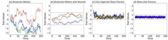 Illustration of four different stochastic processes for trait evolution, each shown with three realizations, where each color represents an independent trajectory in the figure: (a) Brownian motion with and an overall scale of per time step, plotted with horizontal bounding lines. (b) Bounded Brownian-motion paths scaled by and marked by dashed boundary lines. (c) Cox–Ingersoll–Ross (CIR) process , which ensures non-negative trait values and exhibits mean-reverting behavior. (d) Beta-like process with reflective boundaries at 0 and 1, suitable for modeling traits confined to a fixed interval. Varying parameter choices and boundary constraints give rise to qualitatively different evolutionary dynamics.
