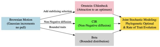 Since there is no closed-form likelihood for jointly using these more general processes , it is necessary to develop advanced statistical methods—such as approximate Bayesian computation (ABC) with efficient algorithms—to estimate parameters and perform inference, thereby facilitating the study of complex evolutionary dynamics. Figure 3 presents an overview of phylogenetic modeling of a trait evolution framework where the diagram illustrates the progression of models starting from Brownian motion (BM) with Gaussian increments, leading to Ornstein–Uhlenbeck (OU) with stabilizing selection, Cox–Ingersoll–Ross (CIR) with non-negative diffusion, and Beta distributions for bounded traits. These models converge into Joint Stochastic Modeling, which integrates phylogenetic optimality and rates of trait evolution for multivariate traits.