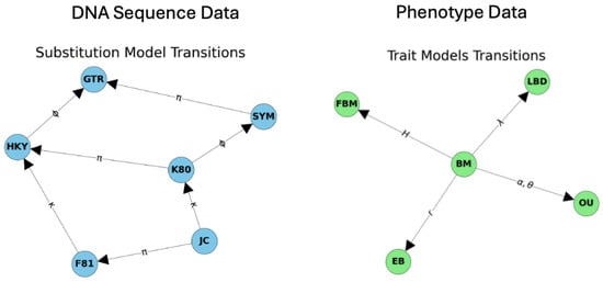 Comparative framework for DNA sequence and phenotype data: Left: Transition map of substitution models, illustrating pathways between models such as JC, K80, HKY, SYM, F81, and GTR. Edges represent model transitions labeled with evolutionary parameters like , , and . Right: Transition map of trait evolution models, centered around the Brownian motion (BM) model. Transitions to other models (e.g., OU, EB, FBM, and LBD) are labeled with key parameters, such as , , r, H, and , representing extensions of the BM framework.