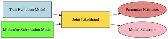 Figure 6 illustrates the integration of trait evolution models and molecular substitution models into a joint likelihood framework. This approach provides a foundation for deriving parameter estimates and performing model selection, ultimately enhancing phylogenetic inference and analysis []: