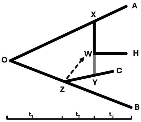 Reticulate evolution, including hybridization and horizontal gene transfer, challenges the assumption of strictly bifurcating phylogenetic trees. As illustrated in Figure 7 [], which includes gene transfer, consider the scenario where trait evolution incorporates gene flow (dashed arrow):
