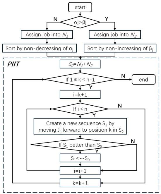 It is well known that the Johnson solution provides the optimal solution to (i.e., [36]), hence the first heuristic algorithm is Johnson solution (denoted by ). In addition, by the calculation procedure of the lower bound, the second (resp. third, fourth) heuristic algorithm is: Sort all the jobs in non-decreasing order of (resp. , ), and this heuristic algorithm can be denoted as (, ). All these heuristic algorithms are further improved by pairwise interchange technology, the flowchart of Algorithm 1 is shown in Figure 1, and these heuristic algorithms can be given as follows: