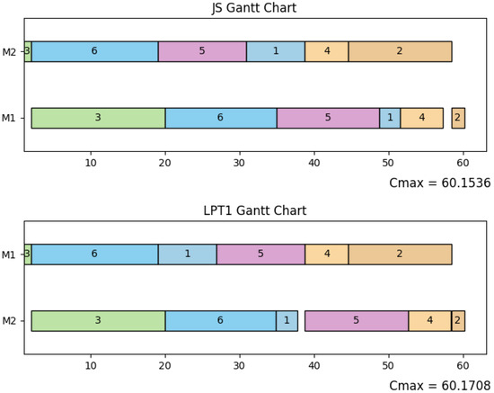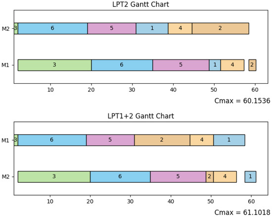 According to the data in Table 1, the parameter can be given as . Figure 2 shows that the initial schedule produced by Algorithms 1 and 3 is , with a corresponding objective function value of 60.1536. The detailed steps of the b-a-b algorithm are outlined below. Once the processing sequence is fixed, the lower bound is determined as by comparing Equations (4), (6) and (8) (other lower bounds are derived following a similar method):