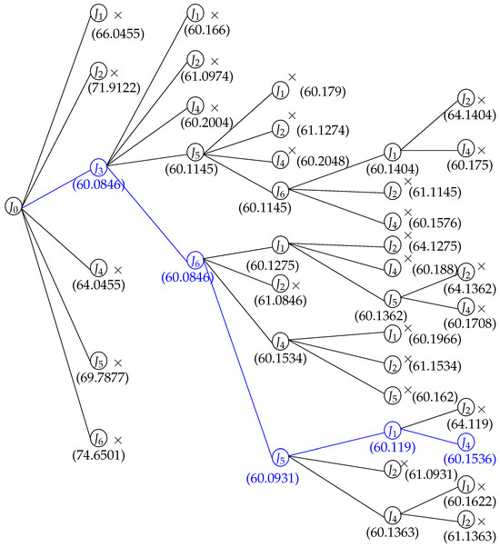 From the b-a-b tree (see Figure 3), it can be concluded that the optimal schedule is , with a corresponding objective function value of 60.1536. In this process, the b-a-b algorithm explores a total of 39 nodes.