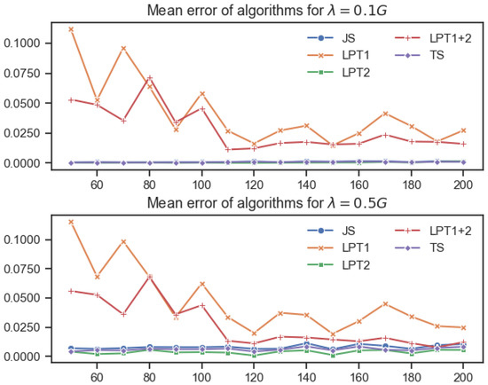 The computational experiments on a large scale were similar to the small scale, and the results of the experiments are displayed in Table 7, Table 8, Table 9 and Table 10 and Figure 5. At the small scale, it can be seen from Table 3 and Table 4 that the CPU time of the b-a-b algorithm increased dramatically with the increase in the number of jobs, and the number of nodes that needed to be traversed also increased sharply. Although the optimal solution to the problem could be found in large-scale cases, the CPU time required was extremely long and unacceptable. Therefore, in the large-scale cases, we mainly verified the performance of the heuristic algorithms. The error rate at the large scale was also computed in a similar way to that at the small scale, except that Opt represented the best solution in the heuristic algorithm and not necessarily the optimal solution to the problem. From the experimental results, it is evident that the accuracy and stability of Algorithms 1, 3 and 5 were significantly superior to those of and . For instance, when , the average error rates for the five algorithms were as follows: , , , , and . However, the running time of Algorithm 5 was significantly higher than the other heuristic algorithms. It can be seen from Table 7 and Table 9 that the running efficiencies of each heuristic algorithm were acceptable. Although the running time of the TS algorithm was longer than that of the other four heuristic algorithms, the maximum running time did not exceed 300,115.19 ms, which is acceptable. The maximum running times of the other four heuristic algorithms were quite similar, all around 7000 ms. Regarding the error rates of each algorithm, Table 8 and Table 10 show that the average error rates of these five algorithms were all no more than 0.11528%, and their maximum error rates were all no more than 1.05166%. Combined with Figure 4, it can be more intuitively concluded that as the number of jobs increased, the error rates of each algorithm decreased, but they were similar overall to those in the small-scale cases. The accuracy rates of Algorithms 1, 3 and 5 were significantly better than those of Algorithms 2 and 4. In summary, it can be seen that the results of the large-scale experiments were similar to those of the small-scale experiments, and the heuristic Algorithms 1 and 3 had the optimal performance in solving .