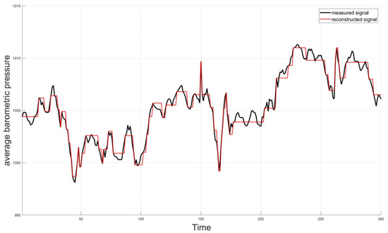 Figure 1 and Figure 2 show example reconstructions of the 7th-dimensional average air temperature and the 13th-dimensional average barometric pressure, respectively. The measured signals are depicted by the black lines, while the reconstructed signals on the receiver side are depicted by the red lines.