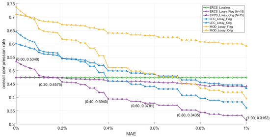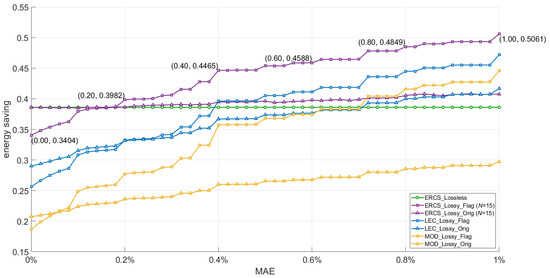 The relationship between the overall compression rate and the MAE for each method is depicted in Figure 7, The MAE ranges from 0% to 1.0%. Similarly, Figure 8 illustrates the relationship between energy saving and the MAE. In ERCS_Lossy_Flag and ERCS_Lossy_Orig, the parameters are all set to 15. The experimental results of the ERCS_Lossy_Flag algorithm for MAE equal to 0%, 0.2%, 0.4%, 0.6%, 0.8%, and 1% are labeled in the figure.