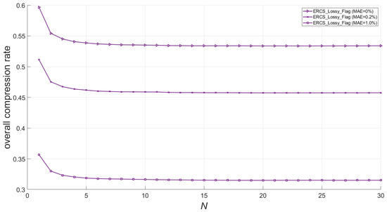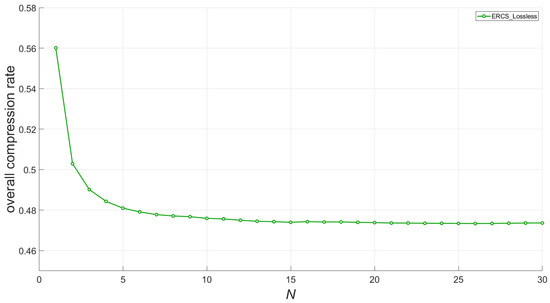 As for , it will affect the accuracy of the predicted parameter and thus the overall compression rate. Figure 9 and Figure 10 show the effect of the pre-set parameter on the overall compression rate in ERCS_Lossless and ERCS_Lossy_Flag, respectively. When choosing , it is common to choose a value that stabilizes the compression rate to avoid unnecessary computational overhead caused by too large value. As shown in Figure 9, where the decrease in compression rate is no longer as pronounced when is greater than 5, but there is still a certain downward trend. We finally chose because at this point the compression rate has been almost completely stabilized and will no longer change with increasing values.