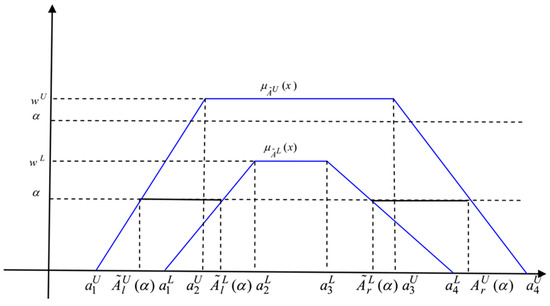 ([33]). An interval-valued fuzzy set on , denoted as a level- interval-valued trapezoidal fuzzy number , is defined as: