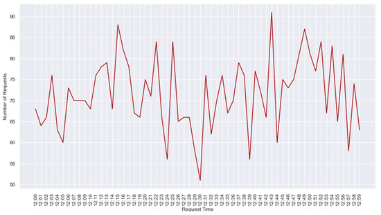 The experimental setup was designed to mimic a real-world ride-hailing scenario. A total of 1000 drivers were randomly distributed across various locations in Manhattan, and the maximum allowable waiting time was set to 5 min. Each driver could only accept a new request after completing their current trip. The total number of vehicles remained constant throughout the simulation, with no additions or removals. Drivers were allowed to continuously pick up and drop off passengers based on the optimization decisions made by the model. Requests were grouped into 0.5 min time-window batches, and unfulfilled requests were carried over to the next batch for reconsideration. Any request that exceeded the 5 min waiting time limit was removed from the queue. The distribution of the number of requests during the simulation is illustrated in Figure 3.