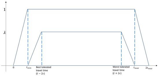 The average of these nine scenarios was used to estimate the travel times, and these travel times, stored in seconds, directly influenced the waiting times, which were modeled as interval-valued fuzzy numbers to capture the uncertainty. An example of the fuzzy representation for waiting time uncertainty is shown in Figure 4, where represents the residual error from travel time forecasting.