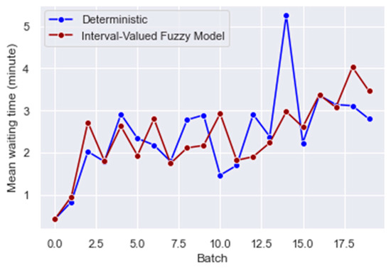 The average waiting time for the simulation results using the deterministic model is 1.94 min, while for the interval-valued fuzzy model, the average waiting time is slightly longer at 1.95 min. Although the difference is slight, the longest waiting time for the deterministic model is recorded at 14.77 min, whereas for the interval-valued fuzzy model, the longest is 15.14 min. Furthermore, the variance in waiting time for the deterministic model is 7.50, slightly lower than the variance for the interval-valued fuzzy model, which is 7.62. This indicates that although the difference in the average waiting time between the two models is insignificant, the interval-valued fuzzy model tends to exhibit a slightly higher level of uncertainty in the required waiting times. It can be seen in Figure 5.