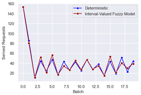 The total number of requests in the simulation results using the deterministic model is 823, while the interval-valued fuzzy model serves 829 requests. The average number of requests served per batch for the deterministic model is 41.15, while for the interval-valued fuzzy model, it is 41.45. Additionally, the variance in the number of requests served per batch for the deterministic model is 997.29, slightly higher than the 966.79 variances observed for the interval-valued fuzzy model. This indicates that although the deterministic model serves a slightly smaller total number of requests, it demonstrates a slightly higher variability in the number of requests served per batch compared to the interval-valued fuzzy model. It can be seen in Figure 6.