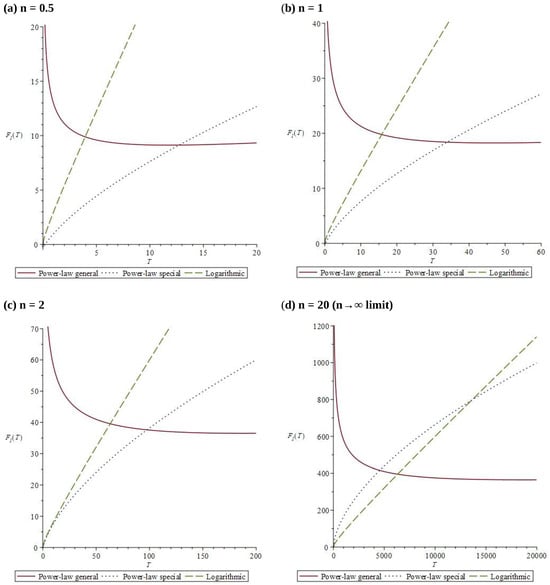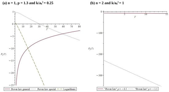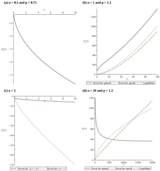 We plotted the and 2 expanding universe case solutions, as shown in Figure 3, to compare with the results in Figure 1 and Figure 2. The case on subfigure (a) is a similar case to those obtained and presented in Figure 1 and Figure 2. The case compares and shows that two power law source cases can be different; this is the case for and power law sources, as in the similar case shown in Figure 2c. The case is described by Figure 1d and Figure 2d and it is useful for case comparisons.