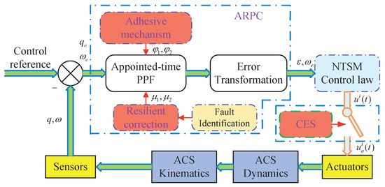 This section mainly introduces the proposed adhesive-resilient prescribed control (ARPC) for spacecraft with a compression event-triggered scheme (CES), which mainly consists of three parts. The first is the design of ARPC under large-scale faults and arbitrary initial conditions. The second is the design of fault-tolerant control law based on ARPC. The third is the design of a compression event-triggered scheme (CES). The overall structural relationship of ARPC and CES is shown in Figure 1.