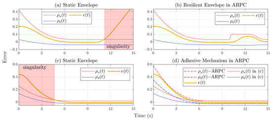 In order to show how the adhesive mechanism works, the comparisons before and after the improvement when facing different initial errors are shown in Figure 3. The parameters are selected as , , , and . It can be clearly seen from the left side that (c) lacks an adhesive mechanism, which causes to break the constraints of the performance envelope and lead to a singularity. In contrast, the right side (d) increases the effect of adhesive mechanism and uses the correction of to obtain new performance envelopes. The original boundary is appropriately modified so that can accurately fall into the constraint interval, and constraints are imposed on until it enters the original allowed interval. When , the adhesive mechanism no longer works, causing to enter a steady state. Through the above improvements, it is ensured that is satisfied at all times, avoiding singularity, which can greatly reduce manual intervention in parameter design.