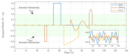 The lumped is obtained by induction as in (6), and the relationship between and actuator saturation is intuitively shown in Figure 5. The green coverage area in the figure represents the available output of the actuator, that is, N·m. It is not difficult to see that the fault scenarios given in Table 2 obviously exceed the , in order to verify the resilience and fault tolerance of ARPPC to large-scale faults. The overall simulation time is set as 150 s with a time step of 0.01 s. The design parameters of the relevant control law based on ARPC and the parameter selection of CES are given in Table 3.