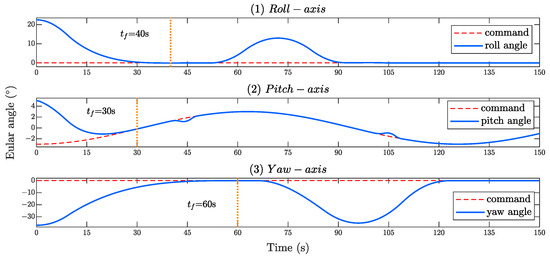 Furthermore, through the proposed fault-tolerant control law, the error can converge to the steady-state performance range within the appointed time specified by the user. It can always ensure that is satisfied. Corresponding to the fault in Figure 5, it is not difficult to see that due to the limitation of ACS actuator saturation, the error will inevitably increase when facing the above-mentioned faults or disturbances exceeding the saturation level. At this time, ARPC can actively relax the performance envelope in advance, temporarily allowing the error to deviate from the ideal steady-state accuracy, and give priority to ensuring the stability of the prescribed performance control. Wait until the fault or disturbance is weakened to the range that the actuator can fully compensate, and then tighten the performance envelope again to achieve higher control accuracy. While solving the robustness and static problems of the prescribed performance control, the conservatism of the controller is greatly reduced. Thanks to the intervention of prescribed performance control, the accuracy of attitude tracking control can reach after entering the steady-state stage. At the same time, it can ensure excellent control stability.