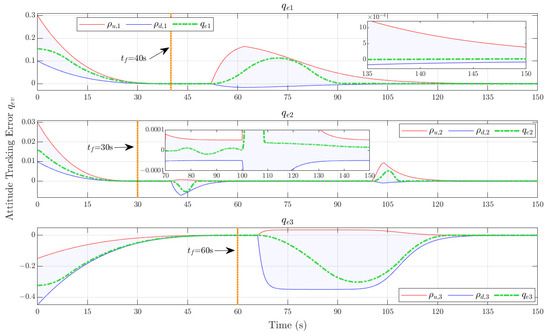 Figure 7 demonstrates the response of the spacecraft attitude under the fault-tolerant control law based on ARPC and CES proposed in this paper. The three sub-figures respectively demonstrate the response of , and the red and blue solid lines represent the upper boundary and lower boundary of the adhesive-resilient prescribed performance envelope respectively. The green dotted line represents the error quaternion .