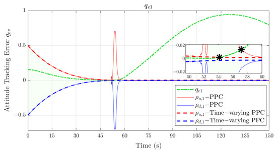 To verify the superiority of the proposed method, Figure 8 shows the results of applying the existing methods to the same fault scenarios in this section. The blue and red dashed lines represent the traditional PPC lower and upper boundaries in [14]. The blue and red solid lines represent the improved time-varying PPC lower and upper boundaries in [19]. As demonstrated in the figure, “∗” means that the error exceeds the inherent performance envelope and it makes the control design suffer from the singularity problem.