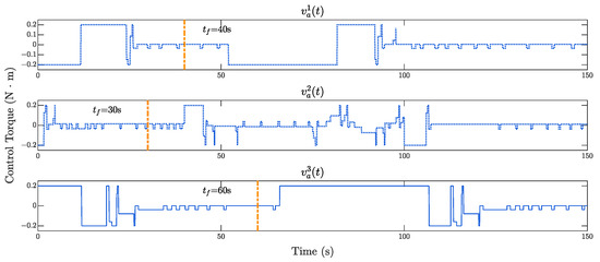 The initial attitude is chosen randomly as , or expressed in quaternion form as . The initial angular rate is chosen as . The thrusters as ACS actuators have limited output capacity, and the maximum output torque of thrusters is assumed to be N·m. Additionally, the external disturbances are supposed as follows: