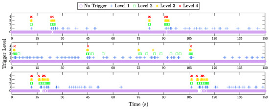 To further demonstrate the advantages of CES, Figure 10 shows the trigger levels recorded by the trigger mechanism at different times. Among them, “No Trigger” means that the actuator does not need to be updated; that is, no data are transmitted between the control box and the actuator at this time. “Level 1” to “Level 4” represent higher-level update increments. It is not difficult to see that the higher the level, the fewer the trigger times, and the system is in a non-communication state most of the time. It will only perform transmission based on compression and decompression when necessary to ensure that the tracking error is within the performance envelope.
