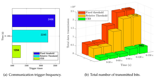 Figure 11a shows the comparison of the number of triggered communications under different event-triggered update strategies, which mainly includes the fixed threshold event trigger mechanism in [28,29], the relative threshold event trigger mechanism in [26] and CET in this paper. It is clear from Figure 11a that the proposed CES update strategy reduces the frequency of communication compared to other methods. Note that CES and z-ary compression transmission accomplish a good balance between tracking performance and network constraints. In order to further demonstrate the impact of different values and coefficient o selection on CES performance, a brief comparison is made here for the scenario when . At this time, the communication trigger frequency will increase sharply to 2128. The total number of transmitted bits will also increase synchronously to 12,768. This is due to the increase of . The number of intervals l that divide also increases accordingly, which leads to more refined and easier to achieve trigger condition judgment. The increase of m directly means that the number of bytes transmitted in a single transmission increases, which will inevitably lead to the increase of the total number of bits transmitted. There is no fixed rule for the selection of coefficient o. Generally speaking, a larger o means that the trigger condition is more difficult to achieve, which will reduce the number of triggers. However, it also means more precision loss. The selection of o should be further weighed according to the required control performance and communication resources.