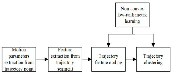 The overall framework of the proposed method is depicted in Figure 1. The proposed algorithm mainly comprises the following five modules: Firstly, based on the outstanding property in which Laplace norm can considerably approximate the rank of the metric matrix, the non-convex low-rank metric learning method is proposed to optimize the metric matrix, thereby enhancing the accuracy of the sample similarity metric during the trajectory feature encoding and clustering process; Furthermore, the motion parameters of trajectory points are extracted to obtain the features of each trajectory point; Moreover, the trajectory can be divided into several optimal homogeneous segments by applying the unsupervised segmentation algorithm, and the statistical features of each segment are extracted. In addition, the trajectory features can be encoded by employing the proposed metric learning method and bag-of-words model. Finally, trajectory clustering can be accomplished by using the proposed metric learning method and the K-means method.