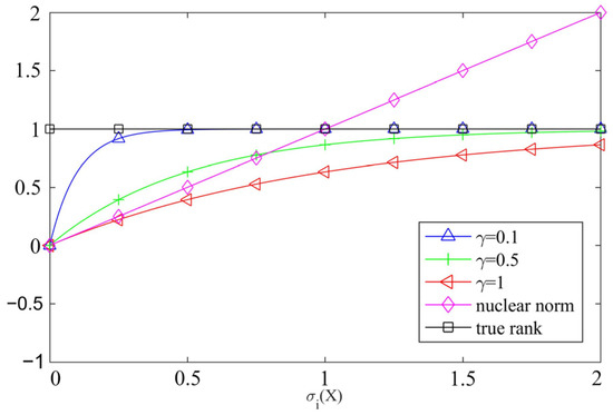 It is known that the Laplace norm, , is a pseudo-norm of the approximate norm [29], which has the following excellent properties: (1) rank approximation: ; (2) unitary invariance: for any unitary matrix , , is satisfied; and (3) positivity: , when and only when and .
