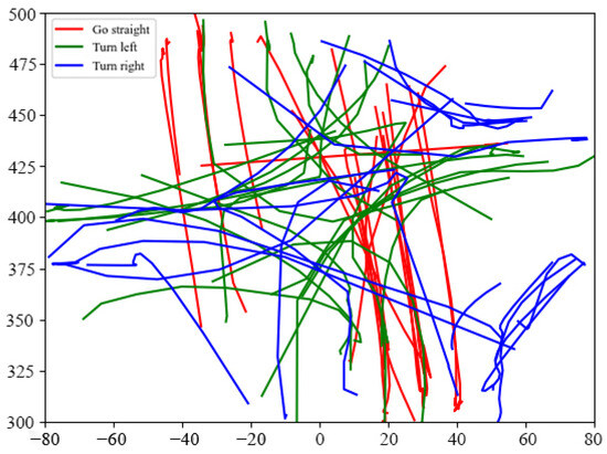 A total of 95 trajectories of straight, left-turn, and right-turn types are generated after filtering. Therefore, 20 trajectories of each type can be obtained, and the trajectories are smoothed with the Savitzky–Golay filter to filter out noise. The real trajectory dataset after processing is shown in Figure 4. The experimental environment is as follows: Intel Core i7-7700 3.60 Ghz processor and 8 GB of memory. The parameter values of the developed algorithm can be set as follows: , , , , , and .