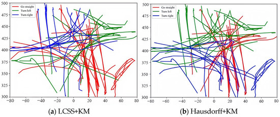 Table 1 presents the precision and recall rates (columns 2 to 4), as well as the accuracy rates (column 5), obtained by each algorithm. It is clear from Table 1 that the clustering accuracy of the compared algorithms is rather low due to the fact that LCSS + KM, Hausdorff + KM, and SSPD + KM only consider trajectory direction, position, and shape information, respectively. As for the developed method, it takes motion parameters, such as velocity, into account and optimizes the metric matrix, which can improve the clustering accuracy and thereby improve the ability to distinguish different types of trajectories. Moreover, compared to the comparison algorithms, the proposed approach has a higher recall rate for straight trajectories, which indicates that the clustering method with trajectory feature coding and shape information can achieve excellent clustering performance for linear trajectories. Furthermore, compared with straight trajectories, the clustering accuracy rate acquired via each algorithm in the cases of the left- and right-turn trajectories is poor because the left and right-turn trajectories are rather similar. According to the description above, it is known that the proposed algorithm has higher accuracy and recall rates compared to the comparison algorithms in the scenarios of straight and left-turn, as well as right-turn, trajectories.