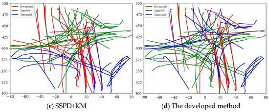 The effectiveness of the proposed algorithm is verified by comparing it with three types of trajectory clustering methods based on distance measurement, including the LCSS distance [10], SSPD distance [12], and Hausdorff distance [6], to measure trajectory similarity, and then the clustering can be achieved by using the K-Medoids (KM) approach with better noise robustness. The clustering results acquired by each algorithm are shown in Figure 5. It is obvious from Figure 5a–c that the upper left-turn trajectory (green) is clustered using LCSS + KM as the right-turn trajectory (blue), while the lower left-turn trajectory (blue) is clustered as the straight turn trajectory (red), the middle left-turn trajectory (green) is clustered using Hausdorff + KM as the straight turn trajectory (red), and the upper left-turn trajectory (blue) is clustered using SSPD + KM as the left-turn trajectory (green). It can be seen from Figure 5d that the proposed algorithm can more accurately gather the trajectories within different regions, such as the upper right and lower right-turn trajectories (blue trajectories). The findings mentioned above can be attributed to the following fact: the compared algorithms only extract some features, such as trajectory direction and shape, for clustering, and thus, the clustering performance is poor, while the developed approach exploits the optimized metric matrix and bag-of-words model to promote the feature coding performance and lifts the clustering effect based on the optimized metric matrix; therefore, the trajectory clustering performance of different regions can be improved significantly.