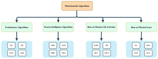 MAs are divided into four categories: evolutionary algorithms (EAs), swarm intelligence algorithms (SIAs), optimization algorithms derived from human life activities, and optimization algorithms based on physical law [8]. The categorization of MAs is presented in Figure 1.