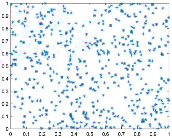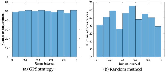 Figure 2 and Figure 3, respectively, show the comparison between the two-dimensional point sets generated by the GPS method and the random method when the population size is 500. Figure 4 illustrates a frequency distribution histogram of the initialized population using the two methods. As shown in the figure, the GPS strategy is more uniform than the randomly generated strategy. In addition, when the sample size is consistent, the distribution of the GPS strategy is similarly consistent, which means that the GPS strategy is stable.