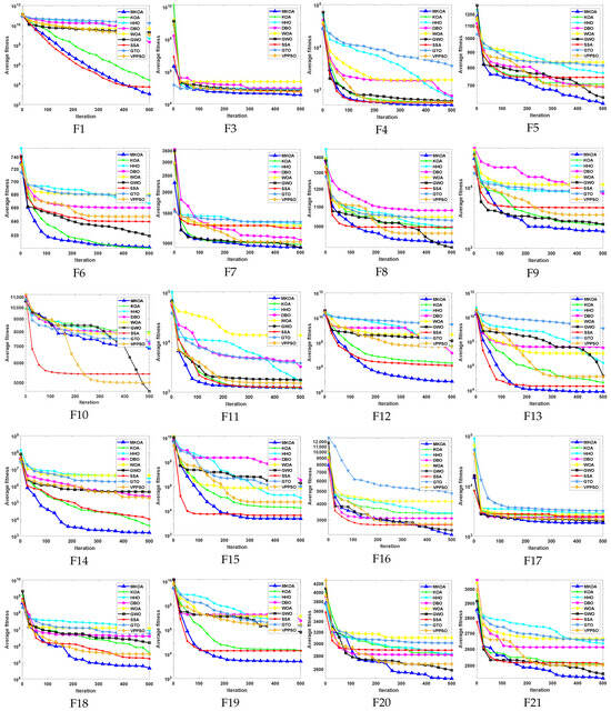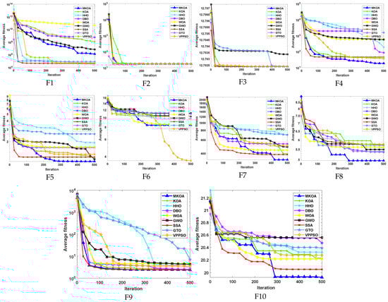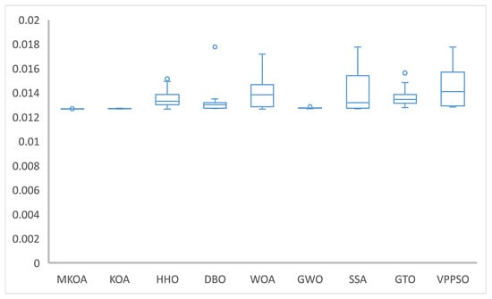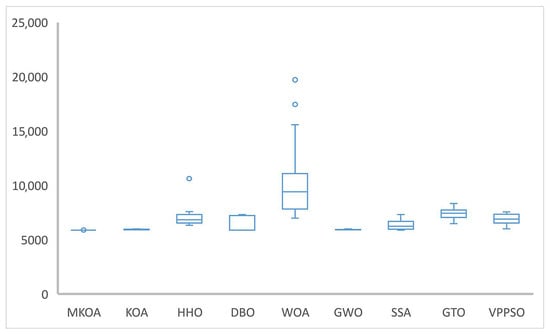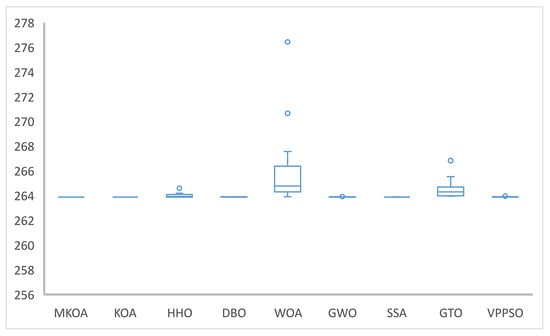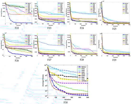 Table A1 displays the experimental data of the MKOA, CEC champion algorithms, SOGWO [62], and EJAYA [63] for the reference of the readers. All algorithms were carried out twenty times independently. Population size and maximum number of function evaluations are fixed at 30 and 10,000, respectively.