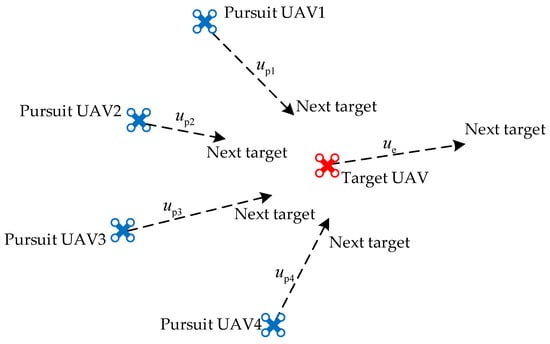 A complete differential game model should include control vectors, state vectors, and the payoff function. Based on the fundamental model of multi-player non-cooperative differential games, modeling and analysis are conducted for the specific case of the multi-UAV pursuit problem. The state vector is used to describe the flight status of the UAV, including the positions, as well as the flight velocity . In the context of quantitative differential countermeasures, each UAV at time is assumed to have complete knowledge of all control strategies adopted by the opponent up to that point. The basic differential game model for the multi-UAV pursuit problem is established by formulating the state equations for each UAV currently involved in the pursuit mission. The countermeasure system equations, which describe the state activities of both parties, are analyzed in conjunction with the payoff function to solve for the equilibrium point and its corresponding optimal strategy. The mathematical model for the quantitative differential countermeasures is formulated as follows: