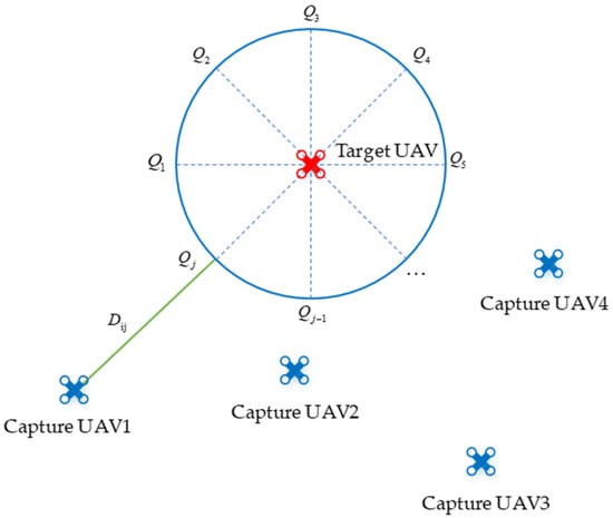 In the initial phase of the target capture, the target UAV and the capture UAVs are randomly distributed within the experimental environment. The capture UAVs then employ a search strategy to detect the target UAV. Once the target is detected, the capture UAVs initiate rapid tracking. With the target UAV as the center, the capture UAVs begin the capture process when the distance between the capture UAVs and the target UAV becomes smaller than the capture radius. The capture is considered successful when the capture UAVs are evenly distributed around the target UAV at a distance equal to the radius of the circular closed pipeline. The condition for a successful capture is when the capture UAVs are evenly distributed around the target UAV and satisfy Equation (1).