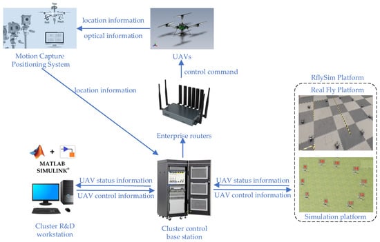 In this study, the Rflysim platform was utilized for both simulation and real flight testing [,]. The platform adopts a model-based (MBD) design concept, which integrates Pixhawk/PX4, MATLAB/Simulink, and ROS, along with commercial off-the-shelf (COTS) smart hardware. It enables simulation and real-time flight/motion testing for unmanned intelligent body control, clustering, and vision-based operations. To address the aforementioned issues, unmanned system modeling, controller design, software-in-the-loop (SIL) simulation, and hardware-in-the-loop (HIL) simulation were performed. MATLAB.