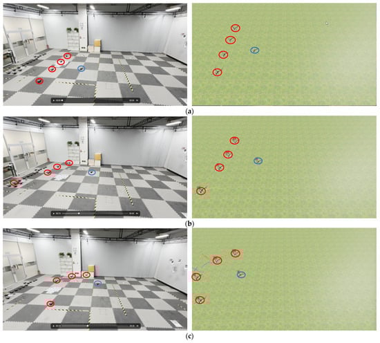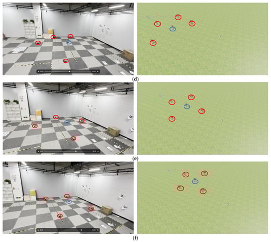 Snapshots of real flight and reflective simulation of UAV capture. (a) Initial positions of the UAVs; (b) target search by capture UAVs; (c) UAV pursuit based on differential game; (d) capture initiates when the distance between the capture UAVs and the target UAV falls below the capture radius; (e) dynamic capture based on closed circular pipeline; (f) capture successfully completed.