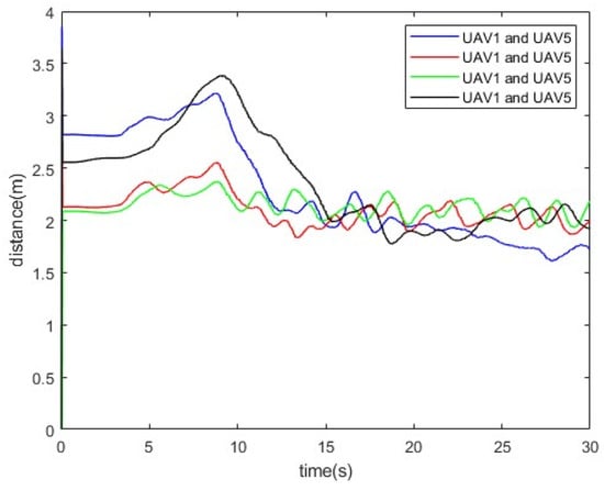 The first through fourth UAVs serve as the capture UAVs, while the fifth UAV functions as the target UAV. Figure 9 illustrates the distance between the capture UAVs and the target UAV during the capture process. Until 8.5 s, the target UAV moved forward to evade the capture UAVs. From 8.5 to 18.7 s, the target UAV was actively tracked, initiating the capture once the distance between the capture UAVs and the target UAV was less than the capture radius. After 18.7 s, the capture UAVs maintain continuous and uniform capture of the target UAV.