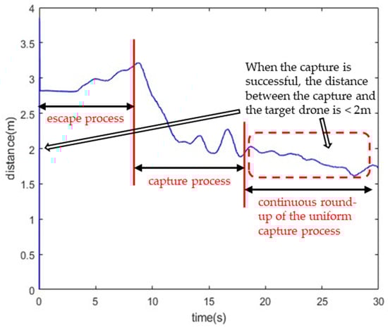 Taking the distance between the fifth target UAV and the first capture UAV as an example, Figure 10 illustrates the three phases of UAV capture: initially, from 0 to 8.5 s, the target UAV moves forward to evade, while the capture UAV hovers, resulting in an increase in the distance between them. Next, from 8.5 to 18.7 s, the target UAV continues its evasion, while the capture UAVs initiates tracking and begins to capture the target UAV. Finally, after 18.7 s, the capture UAV establishes continuous capture and maintains uniform capturing of the target UAV, keeping the distance between the two UAVs consistently below 2 m, which is the sum of the capture radius and the closed circular pipeline radius.