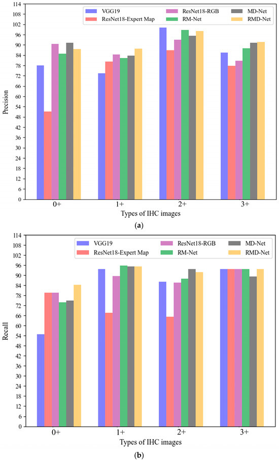 where denotes the number of IHC image samples, represents the IHC score type, is the actual label of the corresponding category, and signifies the IHC score predicted by the Softmax function. The dual-channel scoring network combines the abstract features extracted by deep learning with the specific features defined by experts, making the scoring results not only highly accurate and robust but also well interpretable. Consequently, the overall performance of the model is superior.