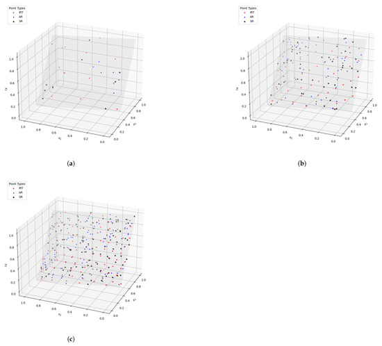 (a) Scatter plot of design points on for . (b) Scatter plot of design points on for . (c) Scatter plot of design points on for .